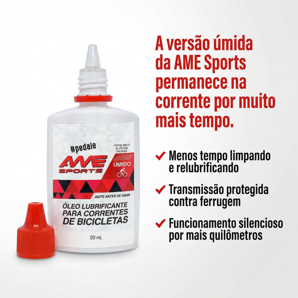 Um lubrificante comum exige reaplicações frequentes e perde eficiência rapidamente em contato com a água. A versão úmida da Ame Sports permanece na corrente por muito mais tempo, mantendo as trocas de marcha suaves e reduzindo o desgaste da relação mesmo em condições severas.