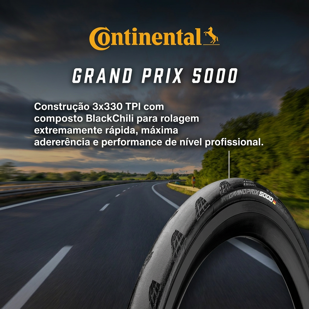 O Pneu Continental Grand Prix 5000 dobrável 3×330 TPI é referência em performance para bicicletas de estrada, combinando baixa resistência ao rolamento, alta aderência e durabilidade. Utiliza o composto BlackChili, referência da Continental em equilíbrio entre velocidade e grip, e armação de fios com 330 TPI que favorece conforto e resposta dinâmica.